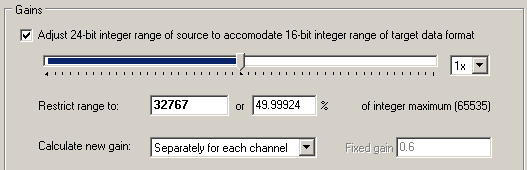 Unless the 'Adjust 24-bit integer range' option is checked under 'Gains', no attempt will be made to change the original integer values. The integer range slider below this option, together the edit fields 'Restric range to:' will set the target integer range. Although less the total 16-bit range of 65,535 will further limit the gain resolution, it may be advisable to avoid using the full range, as follow-up data processing (e.g., blink reduction, filtering, baseline correction) may result in data saturation (PolyRex uses 50% as the default).